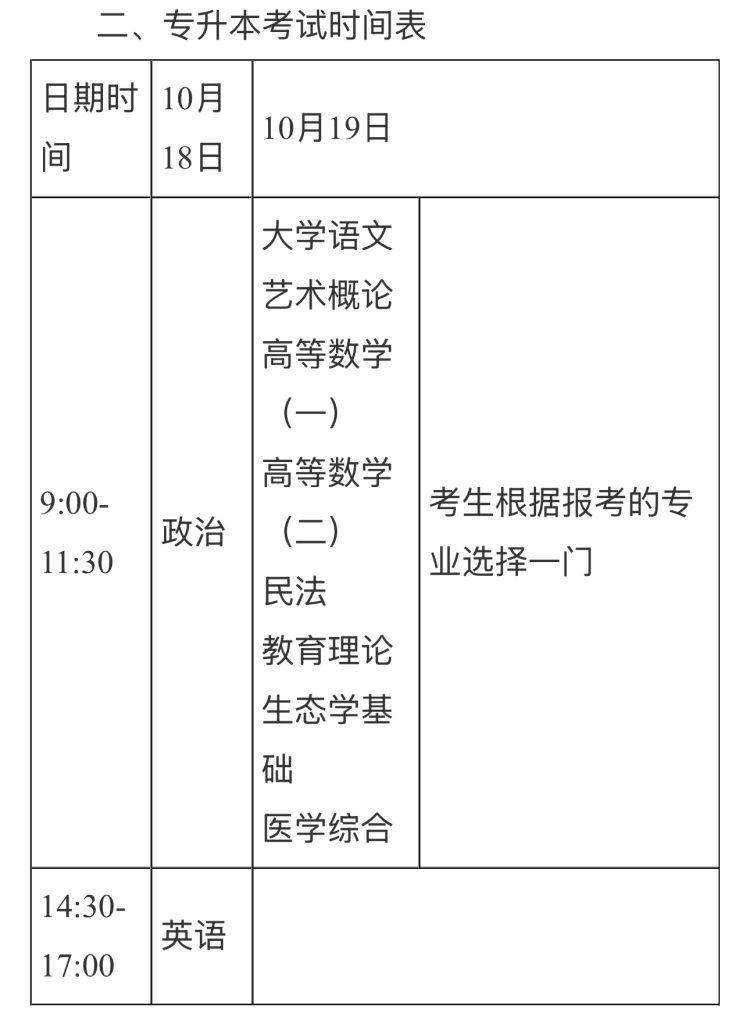 专升本统考科目为政治、英语和一门专业基础课,共3科。专业基础课根据各学科门类的特点设置8个科目。