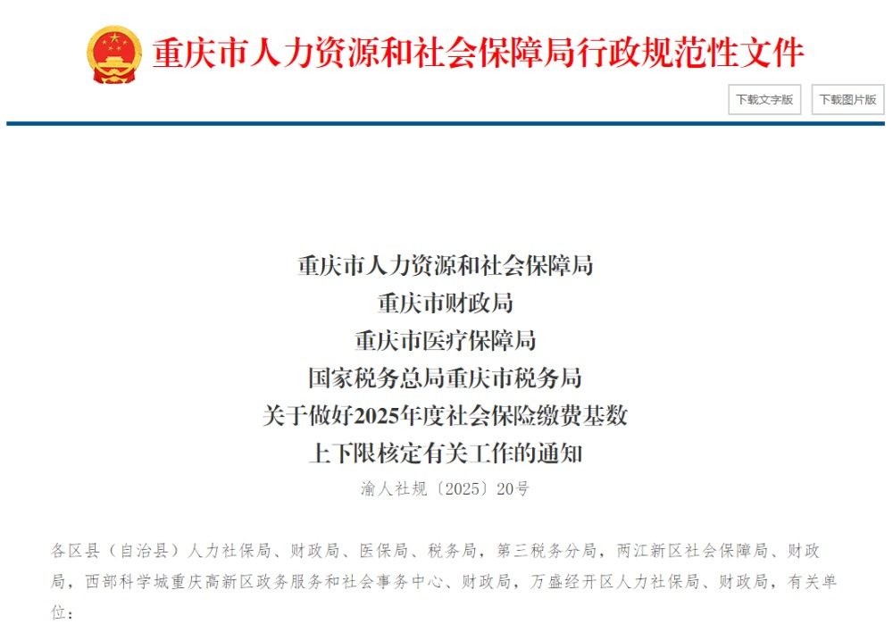 近日,市人力社保局、市财政局、市医保局、重庆市税务局印发文件,对我市2025年度养老保险、失业保险、工伤保险、医疗保险(含生育保险)缴费基数上下限核定有关工作进行了明确。