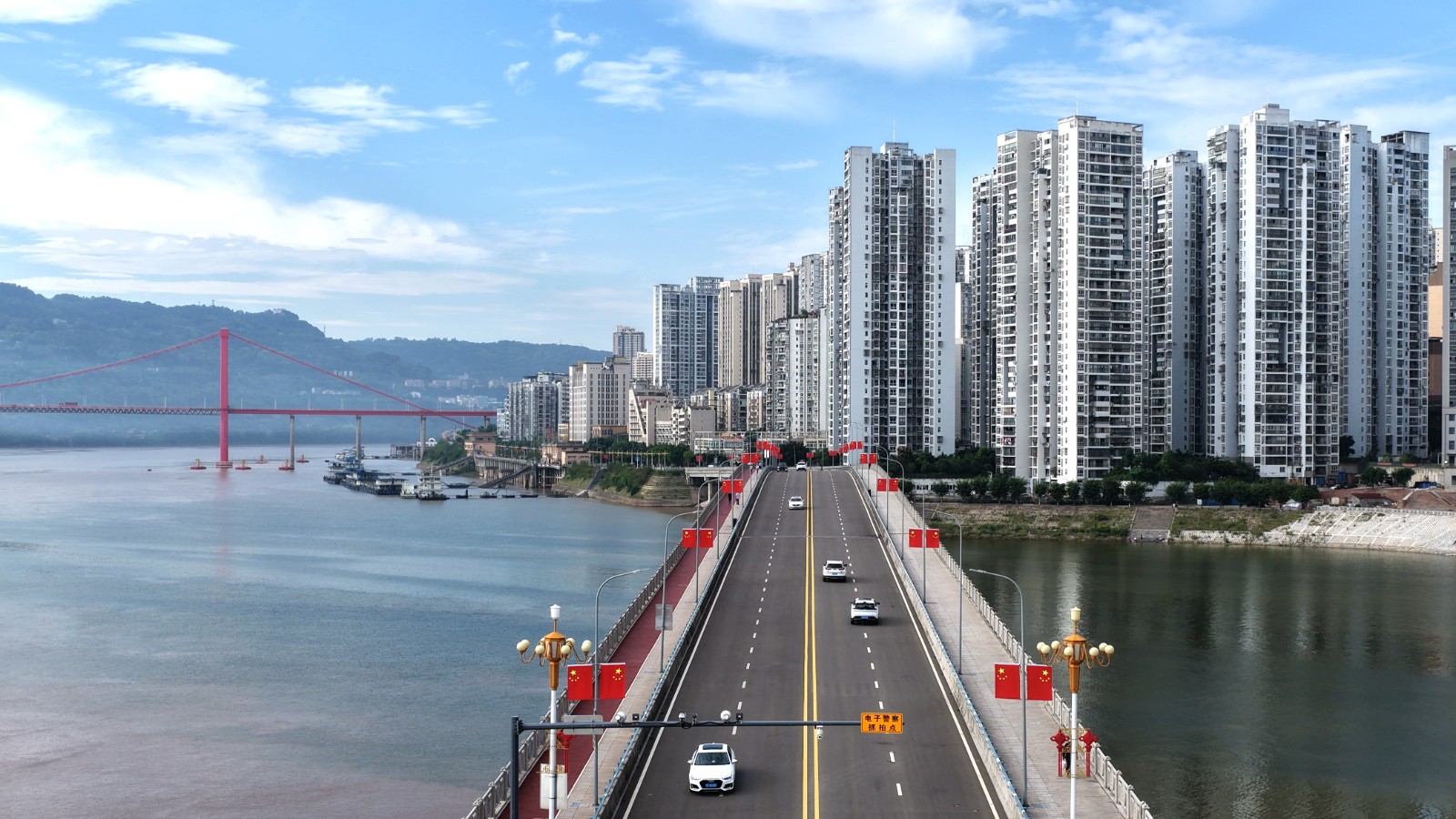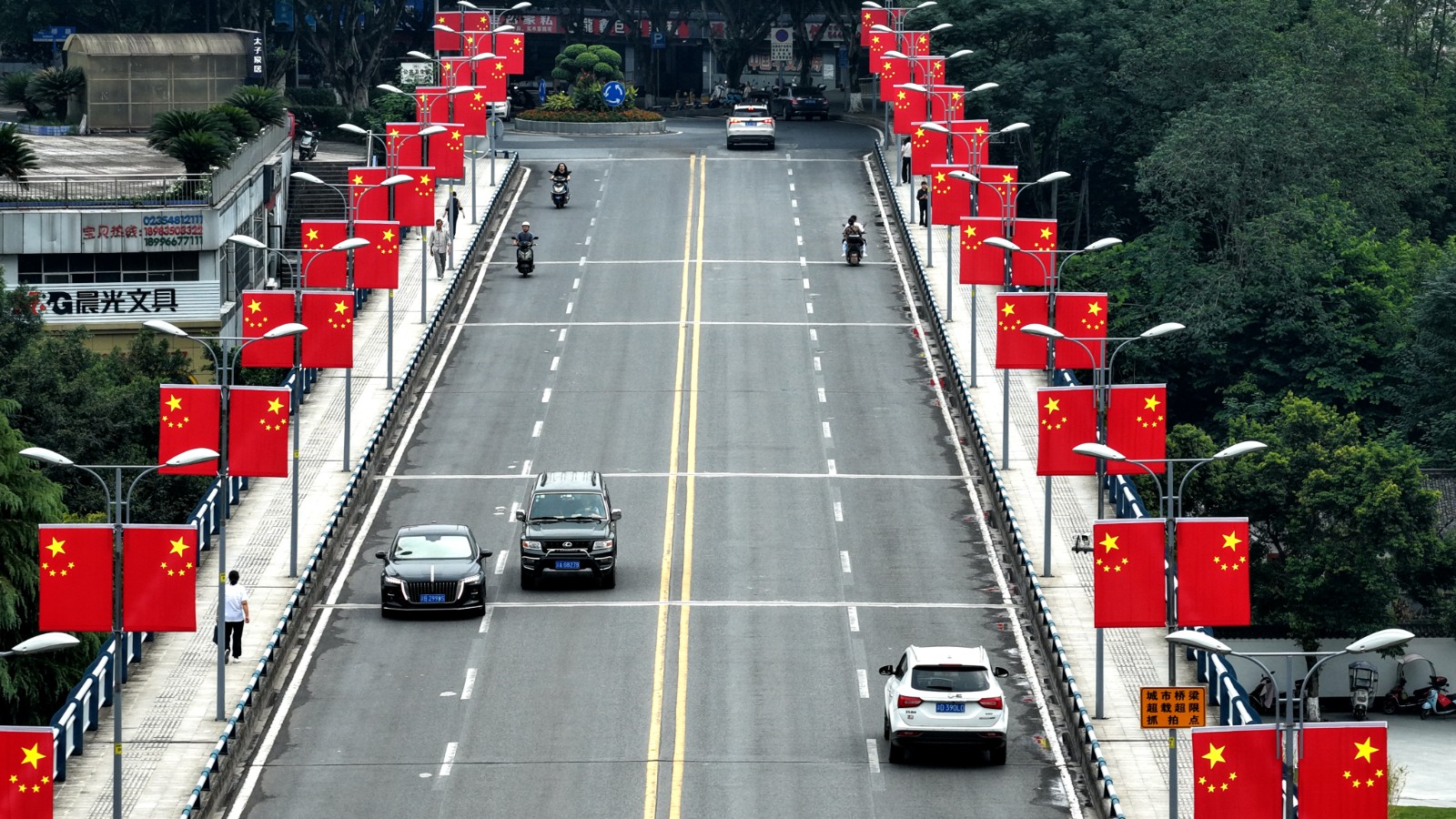 白桥溪大桥上,飘满“中国红”。赵军 摄