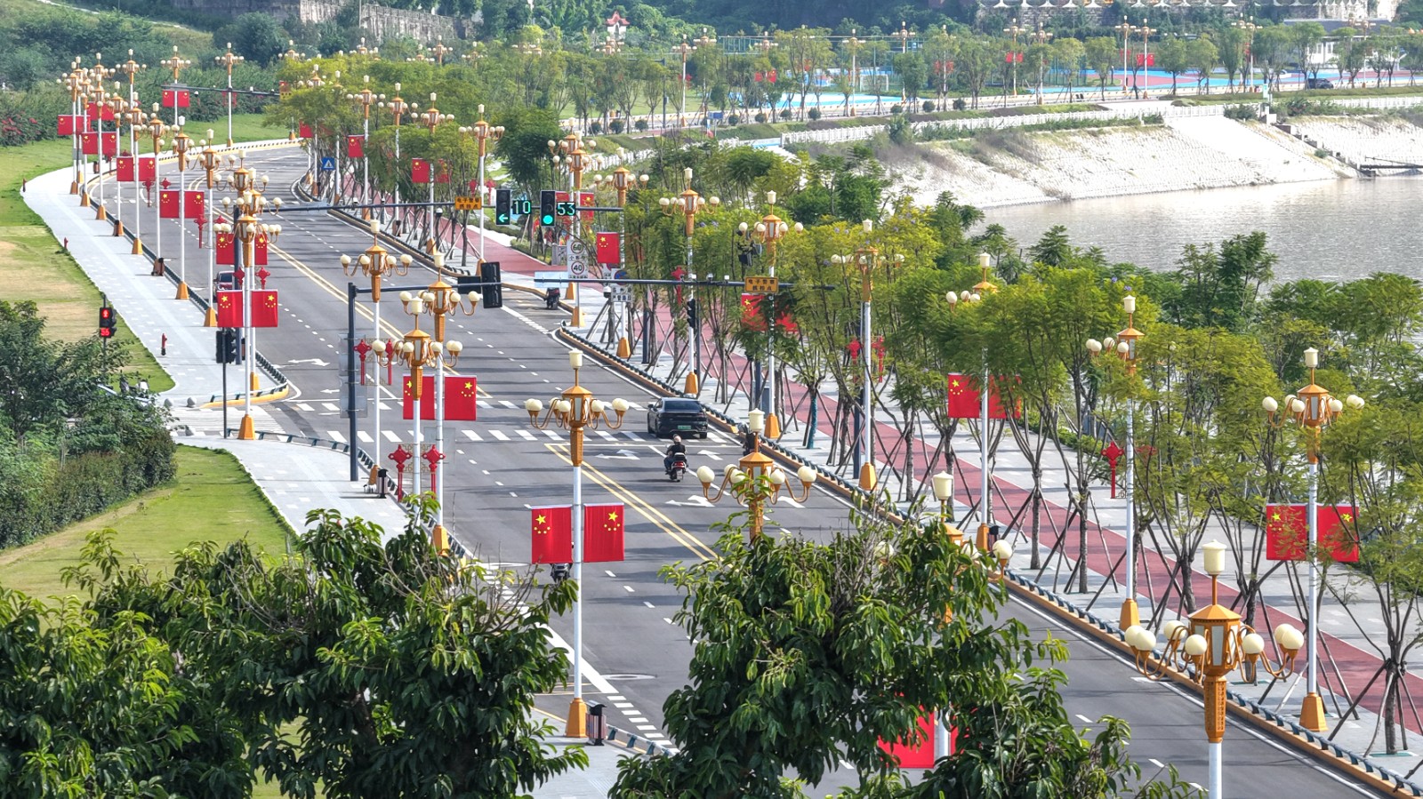 忠义广场道路两侧,鲜艳的五星红旗为节日增添了热烈喜庆的氛围。赵军 摄