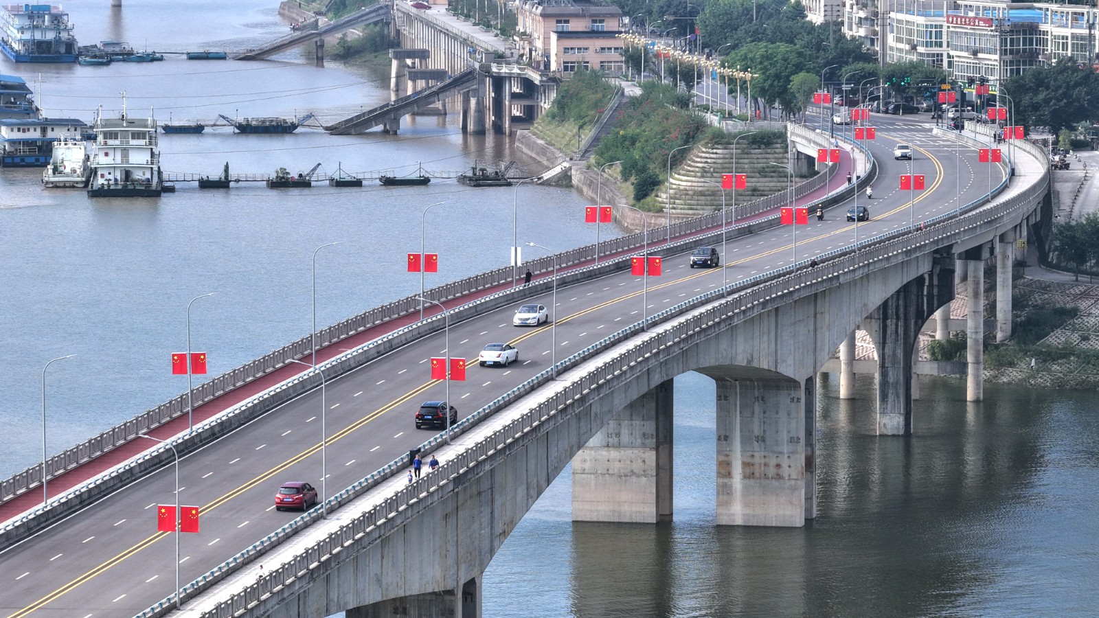 鸣玉溪二桥上鲜艳的五星红旗成为城市中最亮丽的风景。赵军 摄