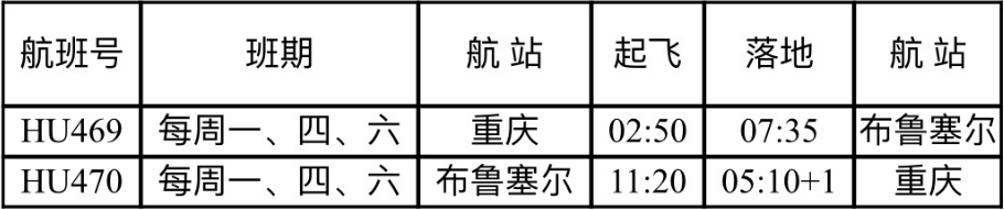据介绍,海南航空重庆⇋布鲁塞尔国际航线计划每周执行3个往返航班,班期为每周一、四、六。去程航班计划北京时间02:50从重庆江北国际机场起飞,当地时间07:35抵达布鲁塞尔国际机场,飞行时长预计11小时45分钟;返程航班计划当地时间11:20从布鲁塞尔国际机场起飞,北京时间05:10到达重庆江北国际机场,飞行时长预计10小时50分钟。(注:航班信息以实际查询为准。)