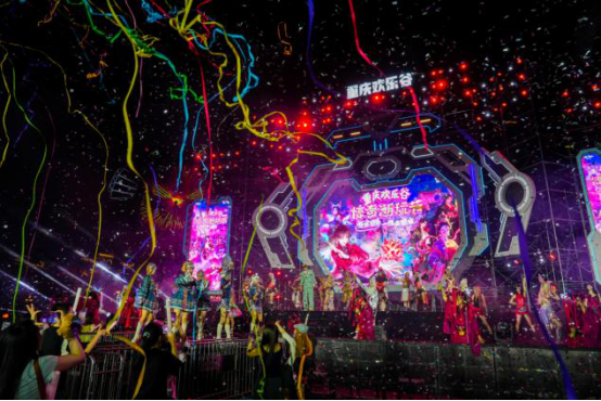 当天,重庆欢乐谷活动再度升级,推出了无人机烟花秀、山城随舞派对、沉浸式互动影视特效剧等融合科技、潮流、实景元素的多重游玩体验,为游客提供了一个假期出游好去处。