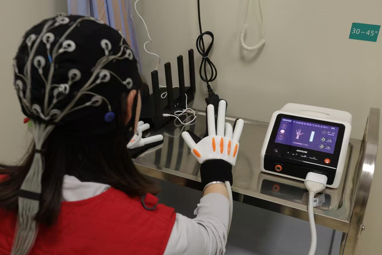 “这个病房最特别的就是脑机接口,它能直接解码大脑意图,将患者对运动的想象、说话的愿望等思维活动,转化为具体的康复指令或设备控制信号。”重医附二院神经内科主任陈阳美介绍,具体来说,患者戴上的脑电信号采集头环,无创地记录其大脑活动时产生的电信号。随后,人工智能分析系统对这些信号进行实时解码,准确识别患者的运动、语言等意图。解码后的指令会驱动康复训练设备,进行康复训练,包括手功能评定、手功能训练、偏瘫肢体综合训练、脑瘫肢体综合训练、截瘫肢体综合训练等。