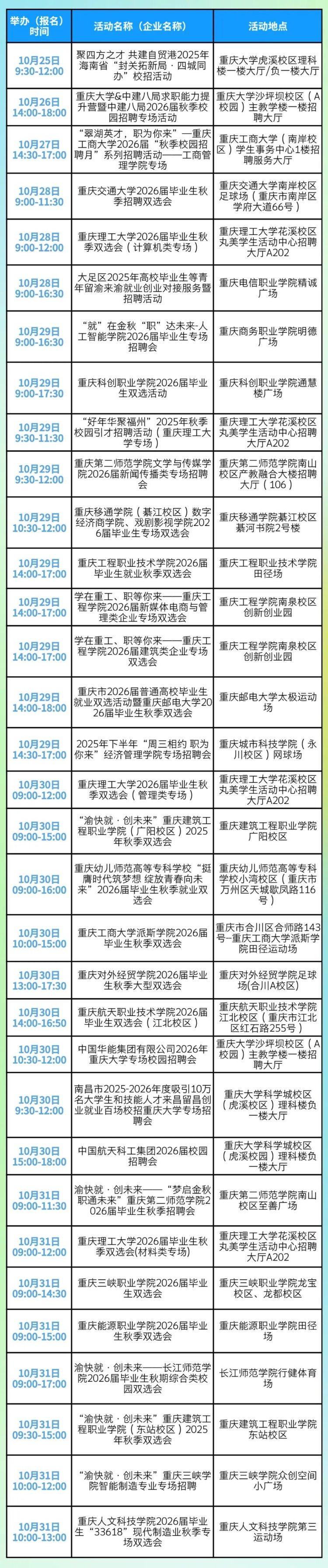 其中,线下招聘活动主要是在各高校举办的毕业生秋季双选会活动,包括重庆大学&中建八局求职能力提升营暨中建八局2026届秋季校园招聘专场活动、重庆工商大学2026届“秋季校园招聘月”系列招聘活动——工商管理学院专场、重庆交通大学2026届毕业生秋季招聘双选会等33场招聘活动。