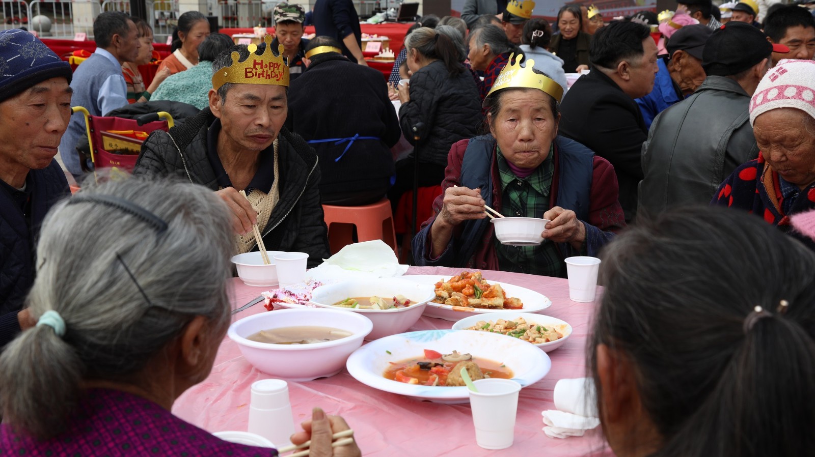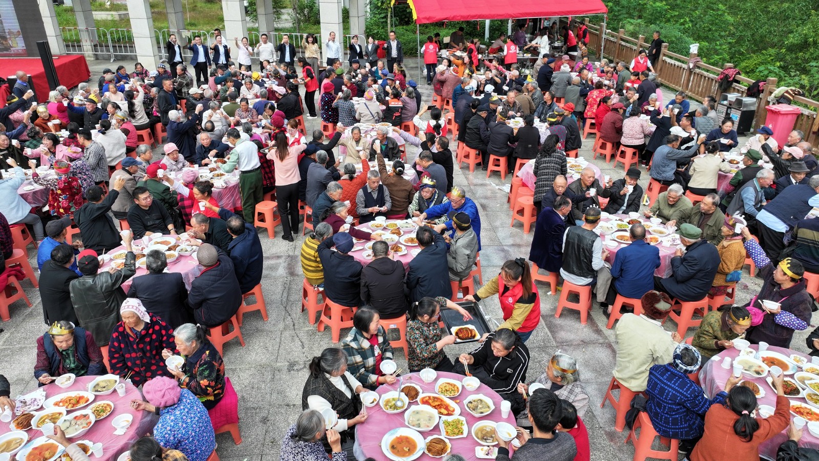 中午时分,志愿者们身穿红马甲,将一道道当地美食端上圆桌,刚出锅的粉蒸肉香气四溢、精心熬制的蹄花汤暖胃鲜美……老人们围坐一堂,闲话家常,在欢声笑语中共享丰盛温馨的“重阳坝坝宴”,现场气氛温馨热烈。