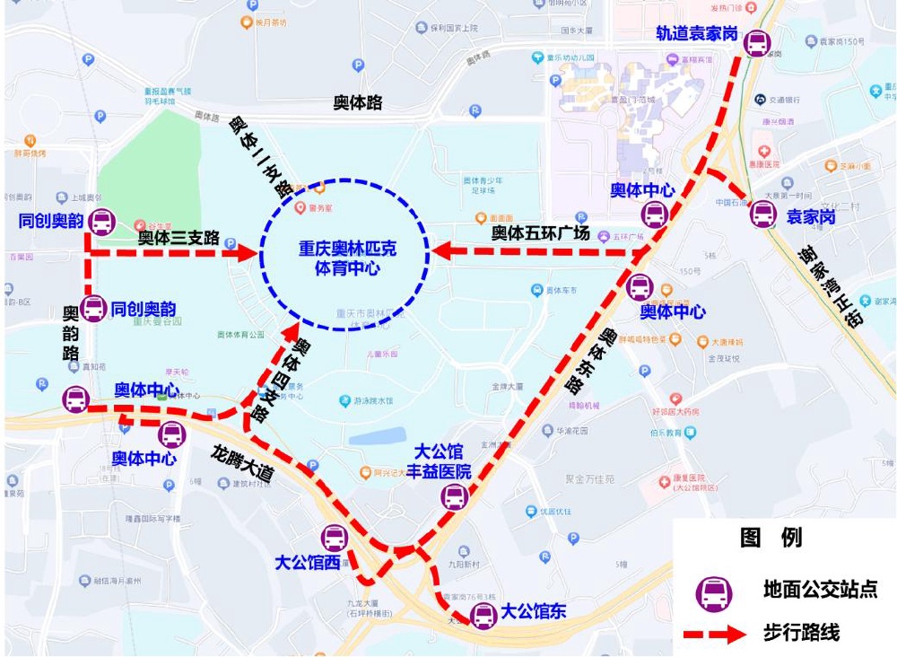 袁家岗片区:奥体东路→奥体五环广场到达;
