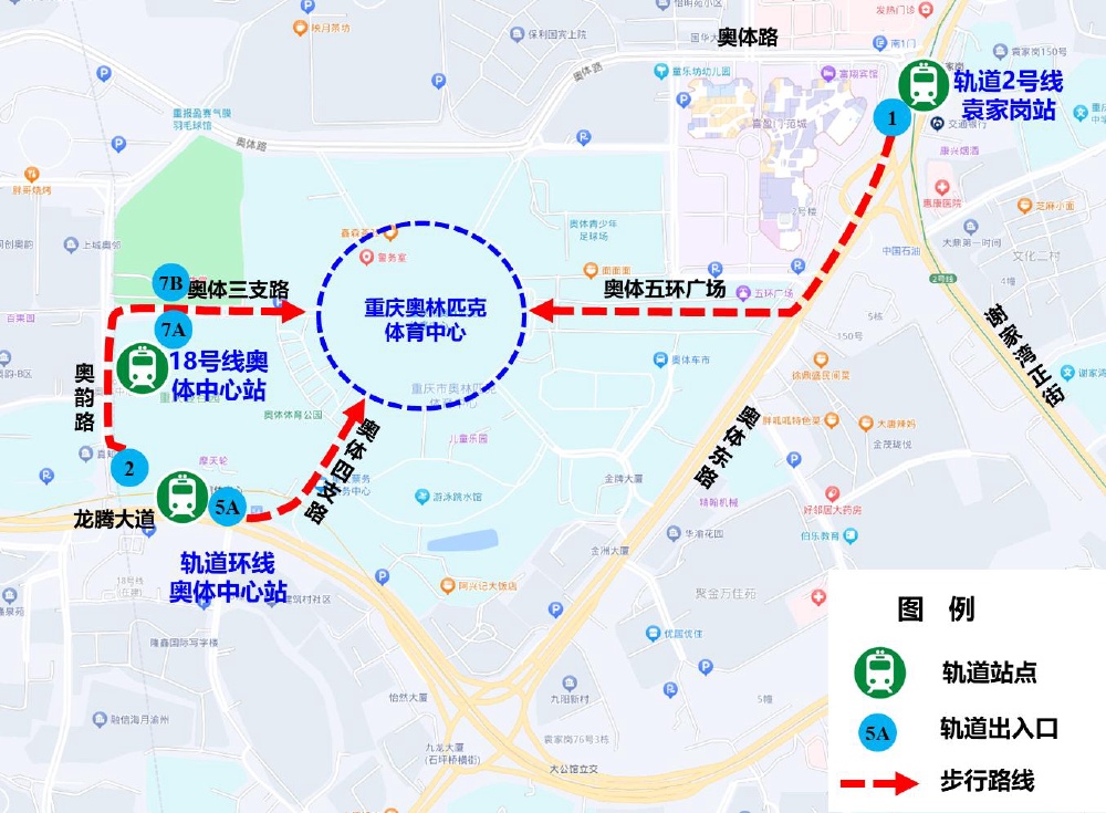 路线七:乘坐公交117路、325路、403路、411路、416路、419路、429路、464路、471路、476路、606路、839路、862路至轨道袁家岗公交站,后步行经奥体东路-奥运五环广场到达;