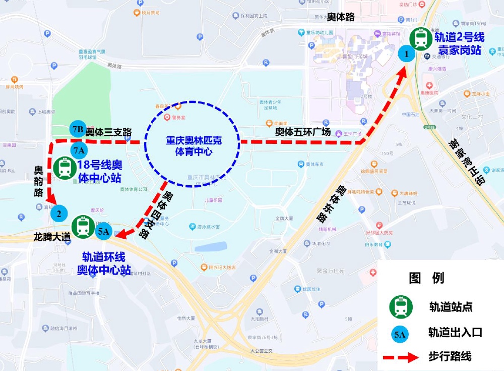 路线一:轨道交通2号线→袁家岗站1号出入口下车后步行→奥体东路→奥体五环广场到达。