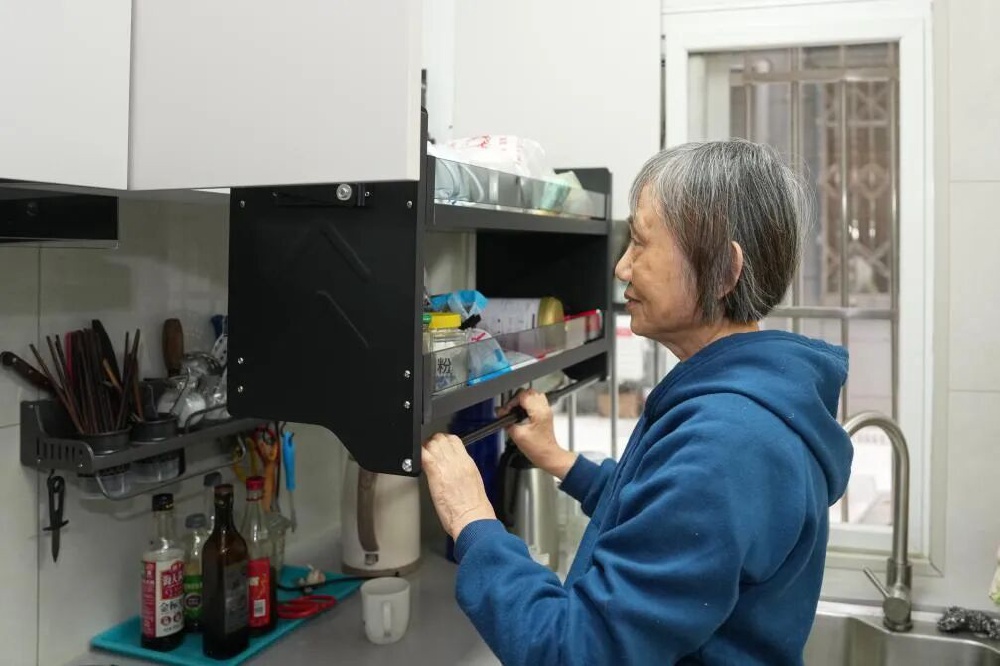 ▲10月27日,浙江省杭州市西湖区北山街道宝石社区71岁居民毛小妹展示适老化改造后的厨房吊柜。记者 黄宗治 摄/新华社