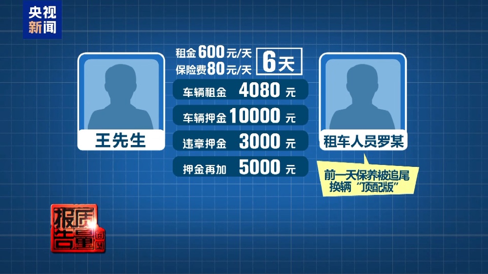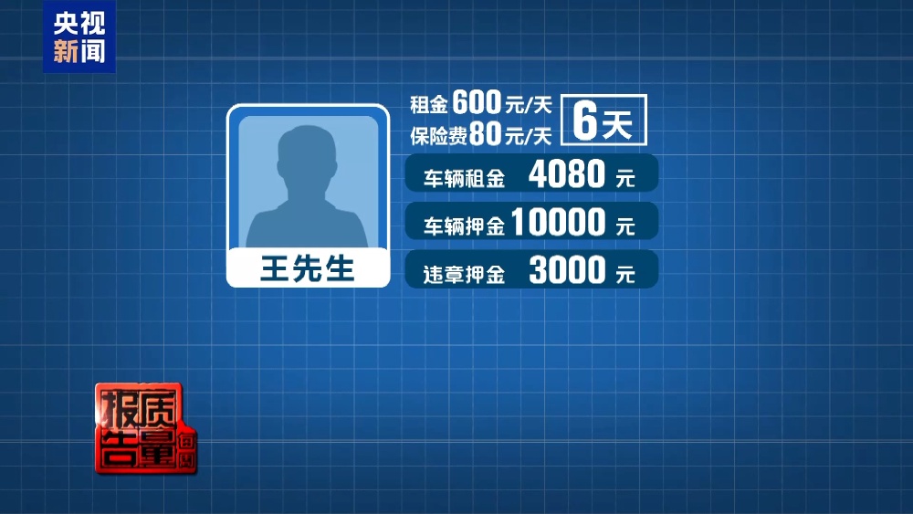 收到资料后,王先生看到租车企业证照齐全,便放下了戒心,对方声称可以异地还车,但需交纳1万元用车押金,考虑到假期紧张,租车公司手续看似齐全,王先生最终同意以每天600元租金,80元保险费的价格,租车6天,共4080元,并支付车辆押金1万元及违章押金3000元。