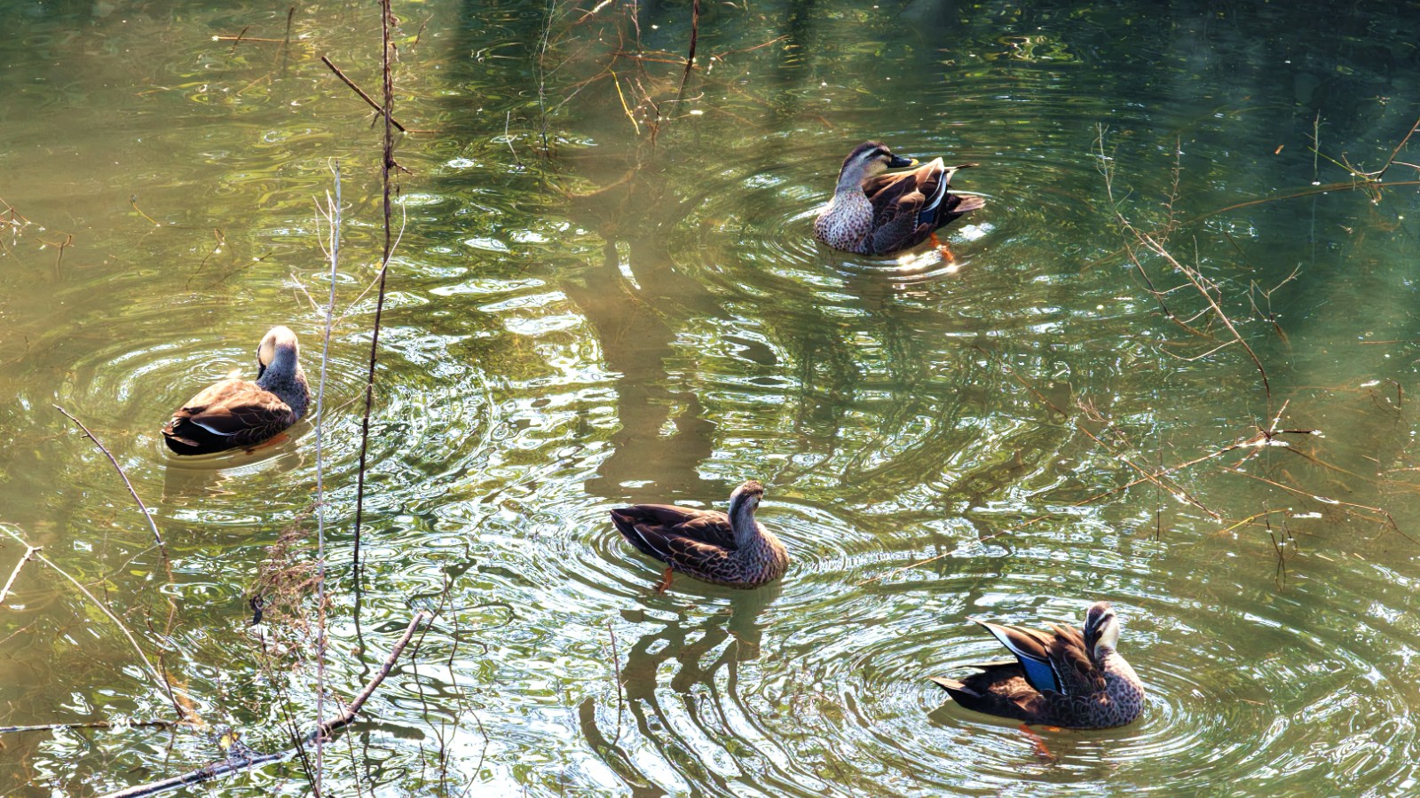 几只斑嘴鸭在东溪河里嬉戏。赵军 摄