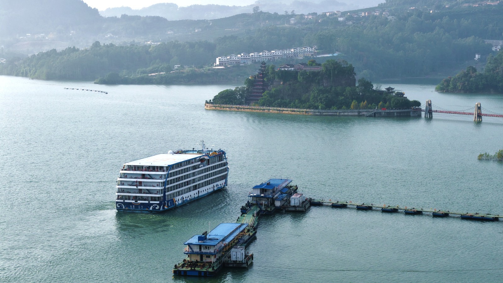 一艘游轮靠泊石宝寨旅游码头(无人机照片)。拍摄:赵军