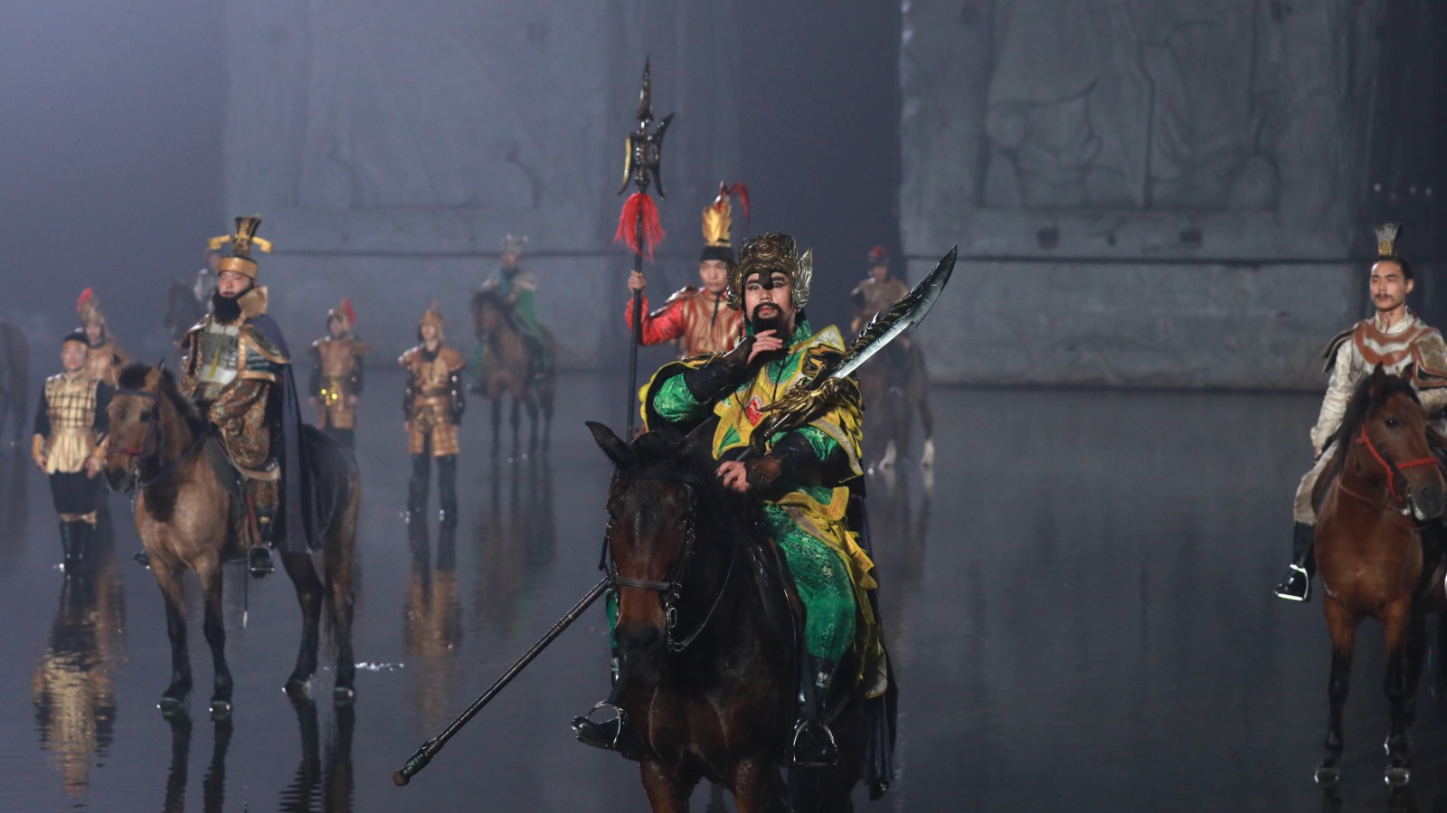 《烽烟三国》大型山水实景演艺以关羽部分传奇故事为主线,内容涵盖“桃园三结义”“过五关斩六将”“火烧赤壁”“水淹七军”等多个三国历史经典场景。剧场采用大型舞台机械、180环形旋转观众席、3D全息式投影等手段,演出通过威亚、光电、水火等特技特效,以及武术、杂技、马术、歌舞等精彩表演,演绎了一出流芳千古的忠义故事,再现了一部波澜壮阔的历史长卷。