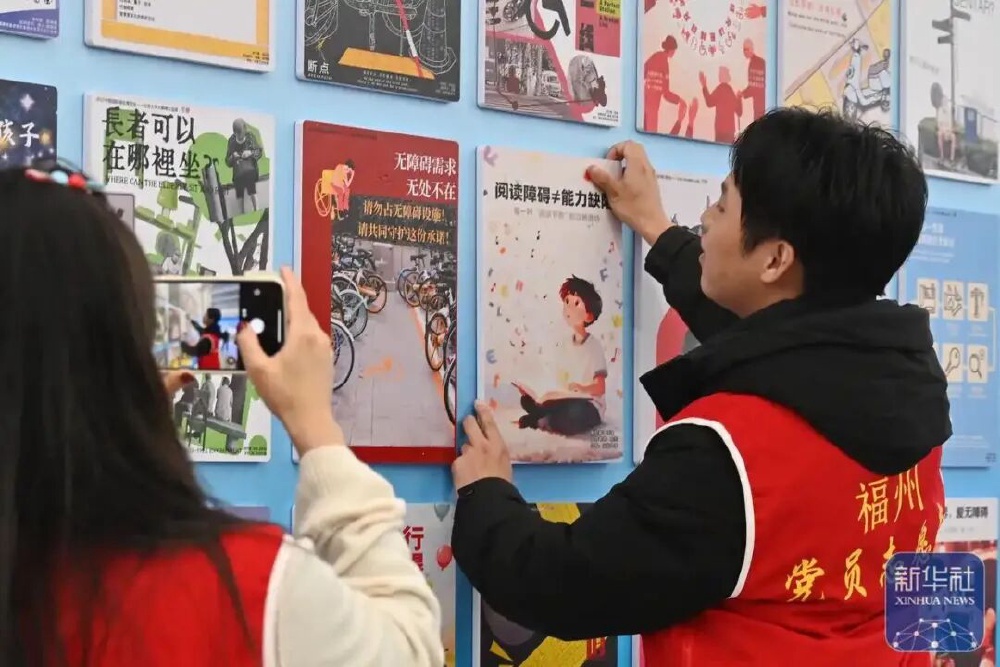 志愿者在福州火车站张贴无障碍公益海报。记者 林善传 摄/新华社