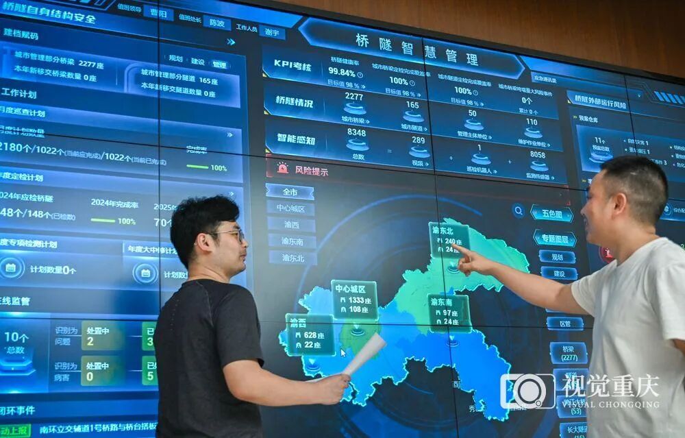 ▲重庆市市政设施运行保障中心监控中心,工作人员在“桥隧智慧管理”应用后台关注数据变化。记者 张锦辉 摄/视觉重庆