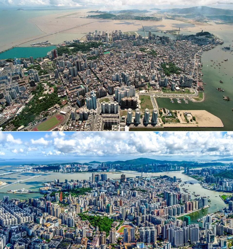 俯瞰澳门(上图摄于1999年,下图摄于2024年)。/新华社