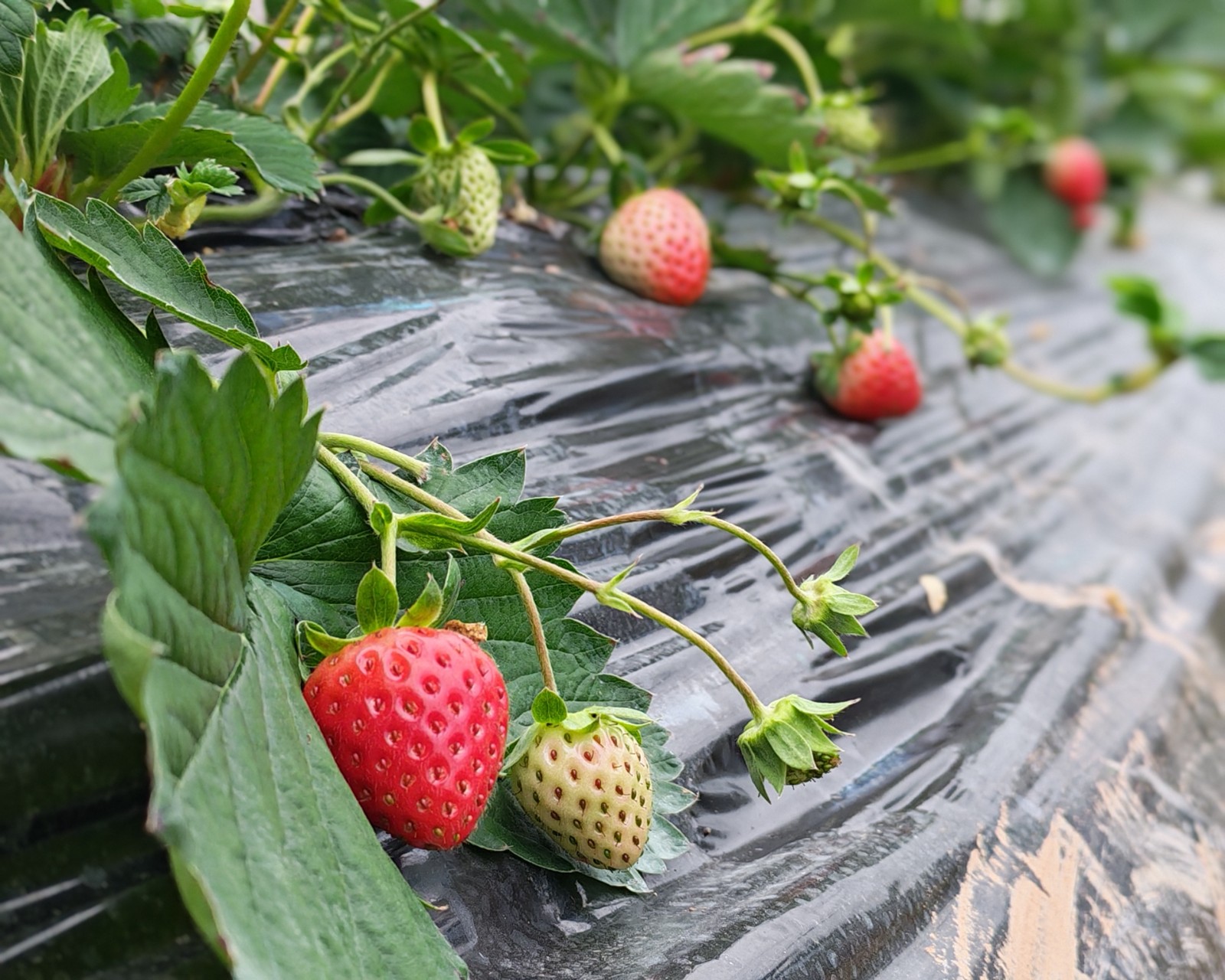 千蜂草莓采摘园目前有5个大棚,配备散热补光、喷灌滴灌等现代化农业控制系统。同时,种植过程施用绿植肥,棚内放置蜂箱,通过物理、生物等方法综合防治虫害,所产草莓品质好、甜度适中,深受消费者喜爱。