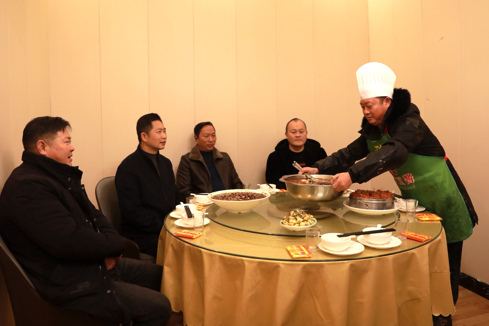 张政国为顾客端上可口的菜肴。赵军 摄