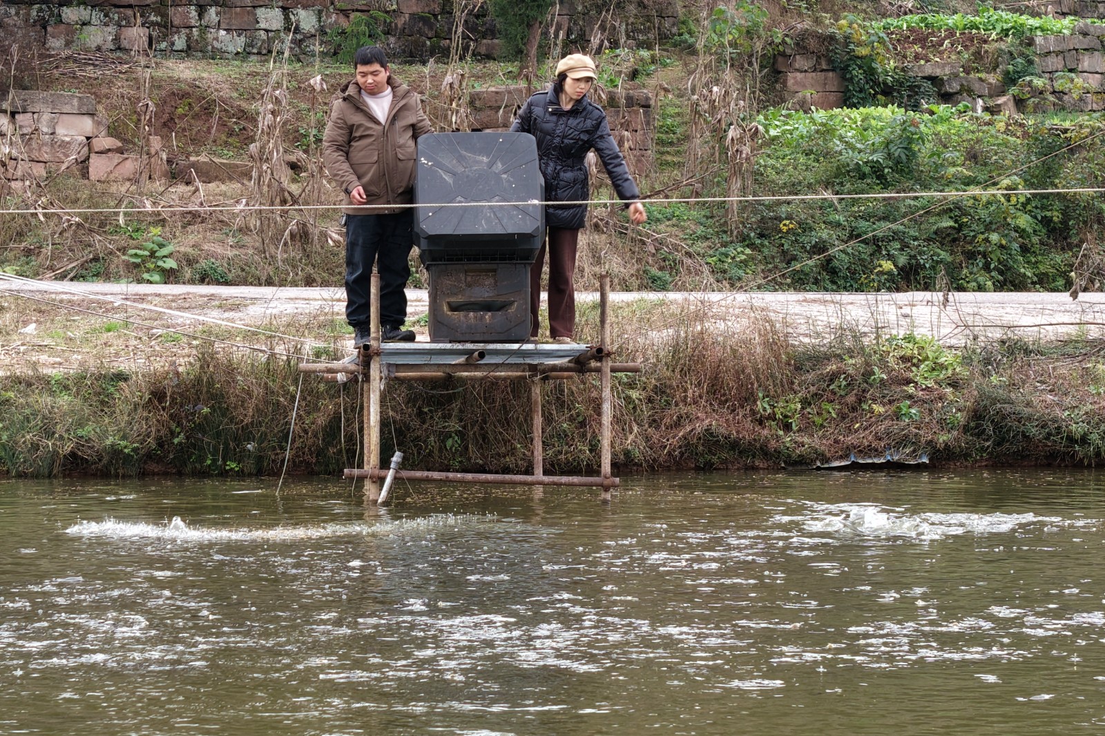 周末,赵武云、张翠夫妇在给鱼儿投食。赵军 摄