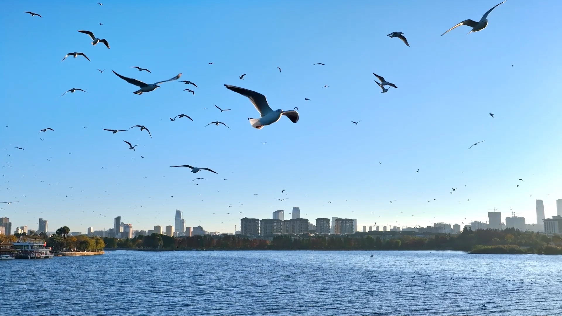 冬日暖阳下,红嘴鸥或振翅掠空,或悠然戏水,为静谧的湖面增添灵动生机。