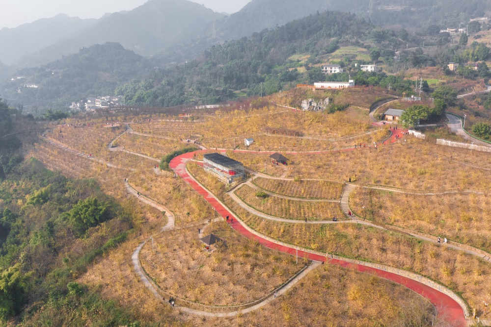 北碚区静观镇素心村,游客们在中国静观蜡梅博览园里游玩(无人机照片)。记者 李雨恒 摄