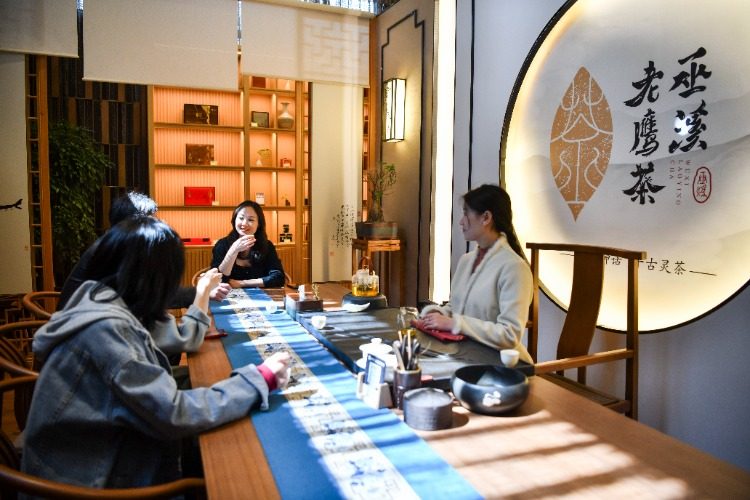 巫溪县城区的老鹰茶体验店,游客正在品茶。(资料图片)记者 谢智强 摄