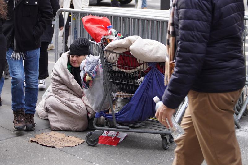 2025年12月31日,在美国纽约街头,无家可归者坐在街边等待帮助。新华社记者 张凤国 摄