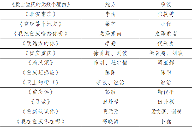 “新韵重庆”歌曲创作大赛优秀作品、入围作品名单