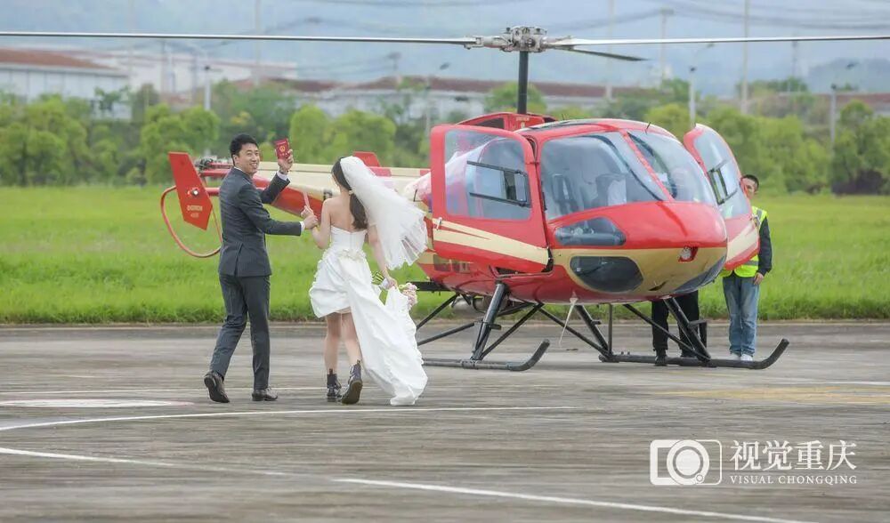 ▲重庆两江新区龙兴通用机场,一对新人牵手走向直升机,开启浪漫低空飞行。记者 张锦辉 摄/视觉重庆