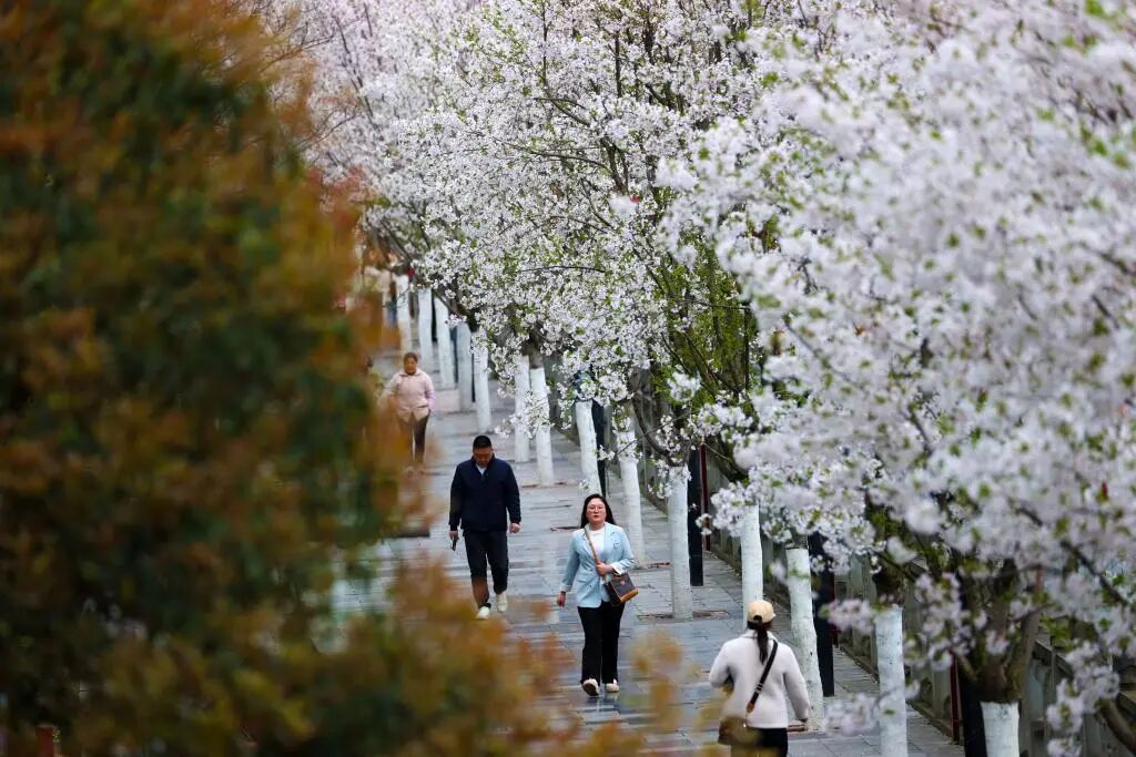▲3月28日,市民在重庆市黔江区武陵水岸樱花长廊散步赏花。杨敏 摄/新华社