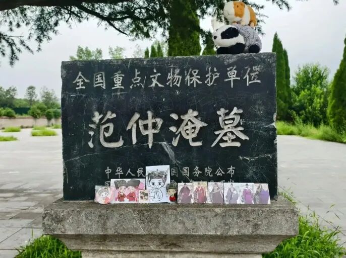 ▲年轻人在范仲淹墓前的文物保护碑上摆放的礼物。/新华社