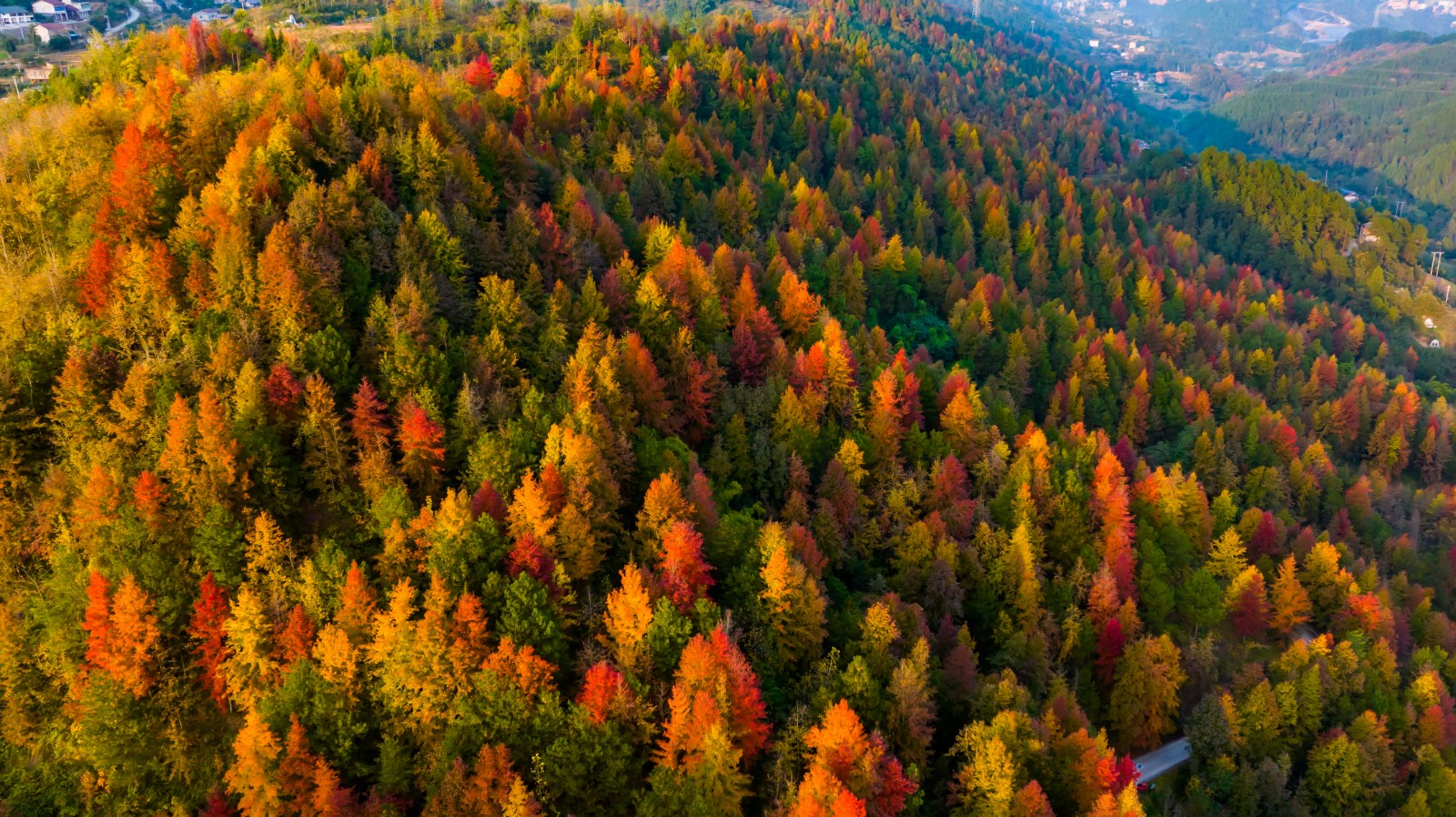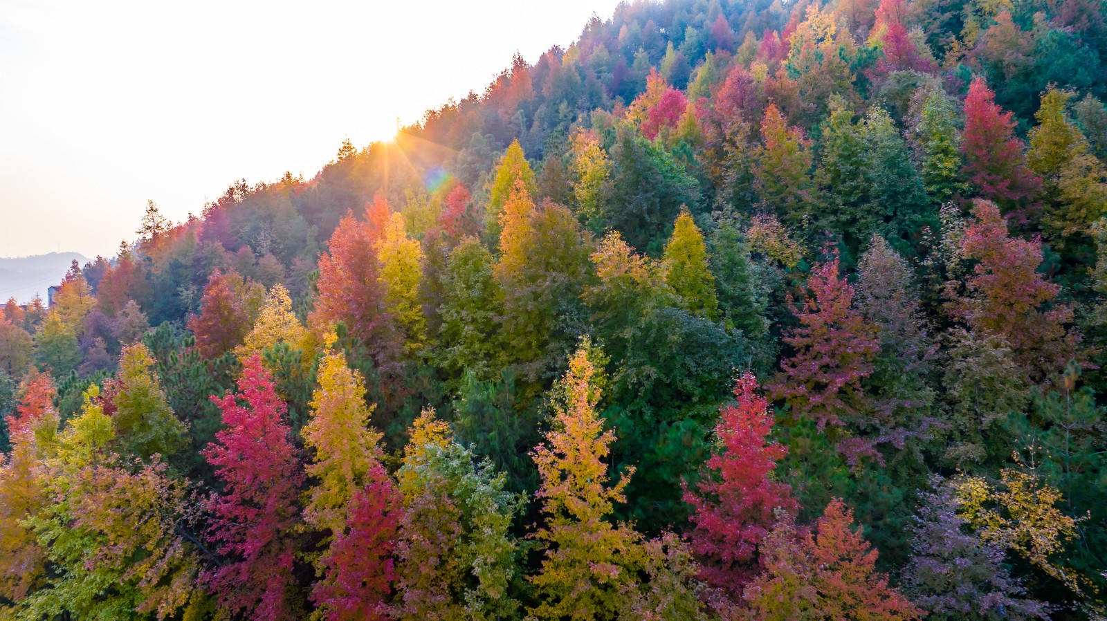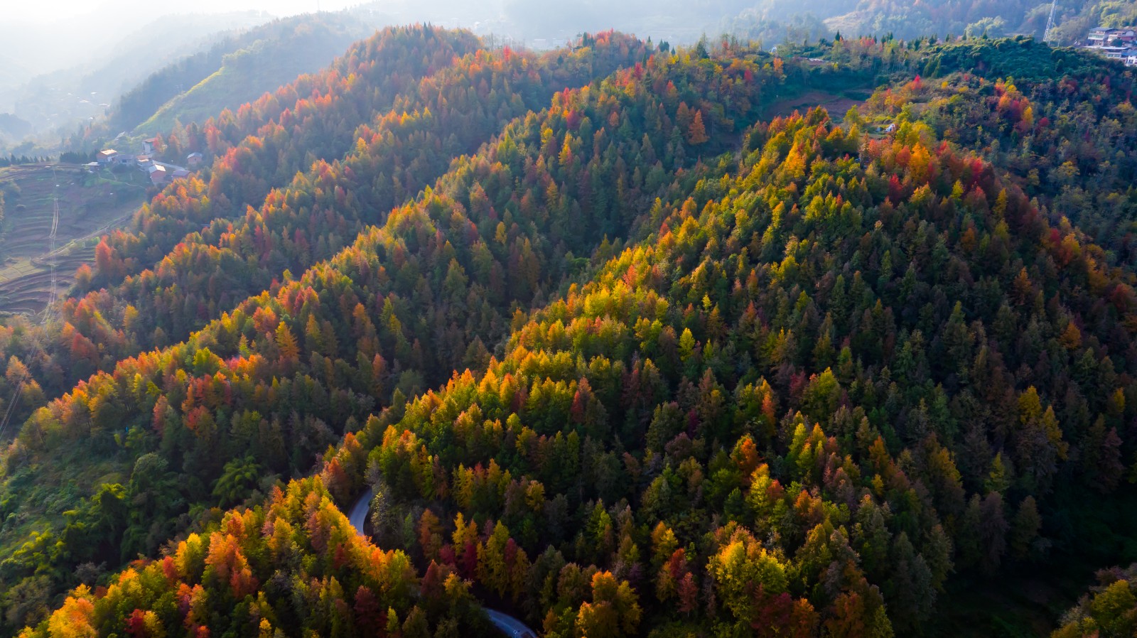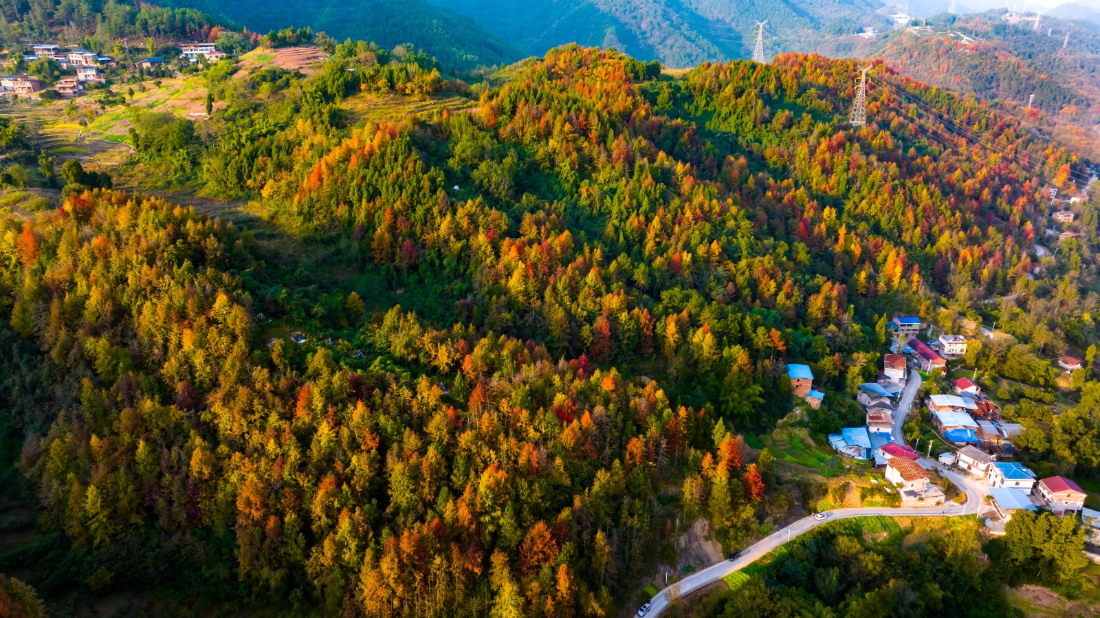 走进忠县白公街道护国村,连绵起伏的彩林依山而植,错落有致。从空中俯瞰,各色树叶层层叠叠,交相辉映,在冬日暖阳的照耀下褶褶生辉,如同给大地穿上了一件五彩霓裳。置身期间,彩叶飞舞,风景秀丽,宛若仙境。