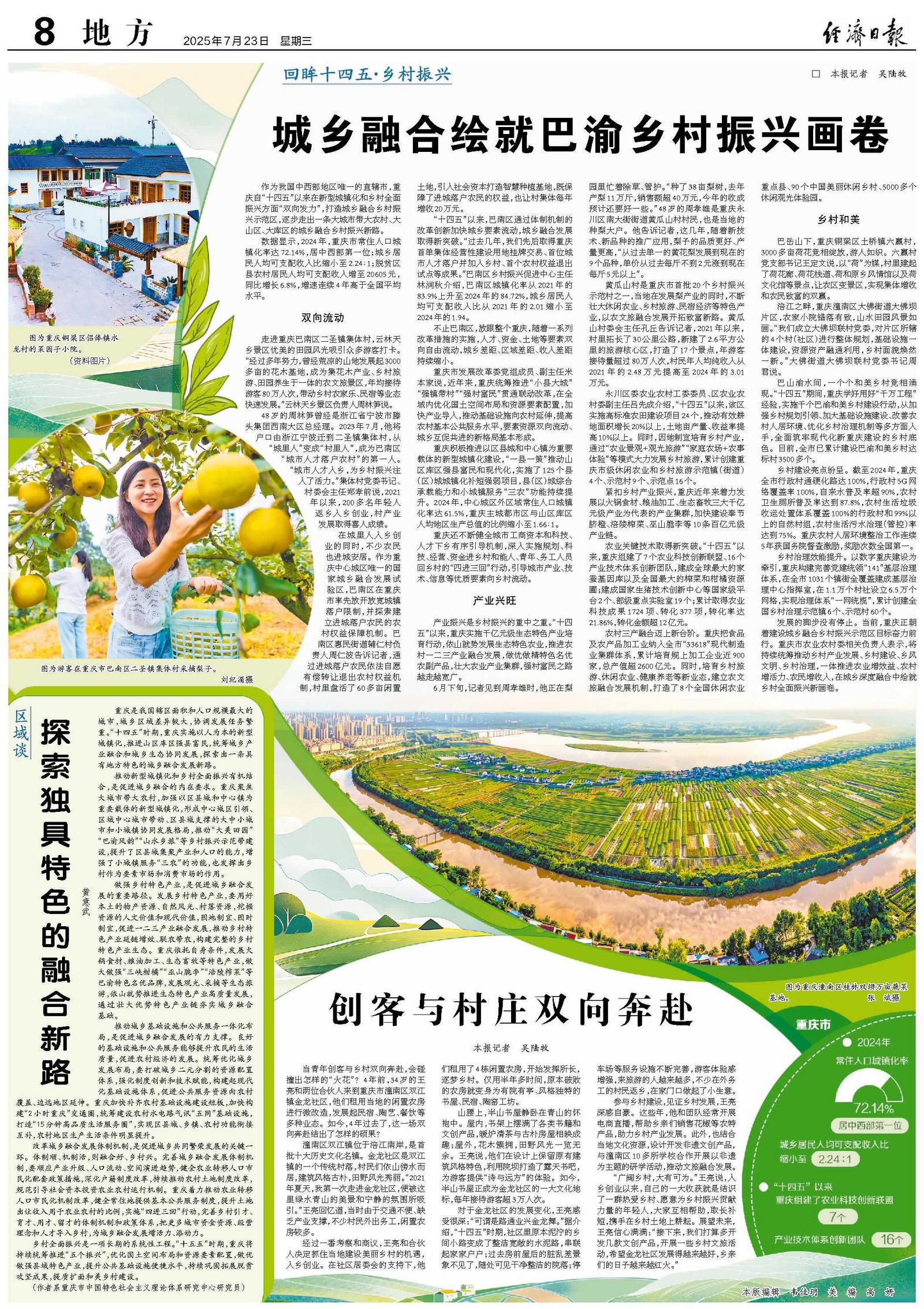 作为我国中西部地区唯一的直辖市,重庆自“十四五”以来在新型城镇化和乡村全面振兴方面“双向发力”,打造城乡融合乡村振兴示范区,逐步走出一条大城市带大农村、大山区、大库区的城乡融合乡村振兴新路。