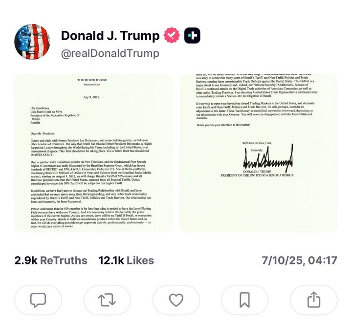 这是特朗普在社交媒体上发布致卢拉信函的截图。