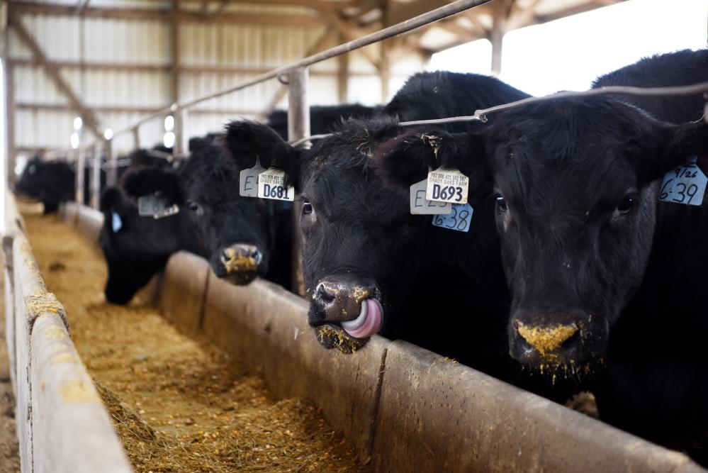 2017年10月31日,在美国奥马哈比尔家庭农场,牛在室内牛圈进食。新华社记者韩芳摄