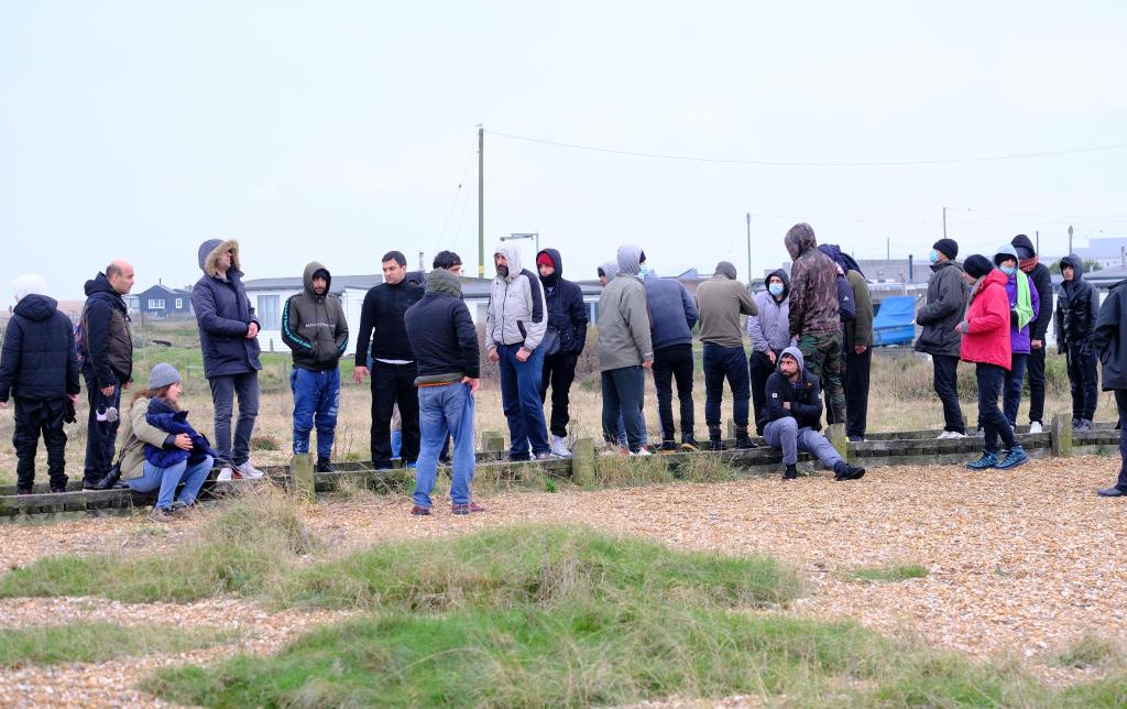 2021年11月24日,移民在抵达英国邓杰内斯角海岸后等待。新华社发(史蒂夫·芬恩摄)
