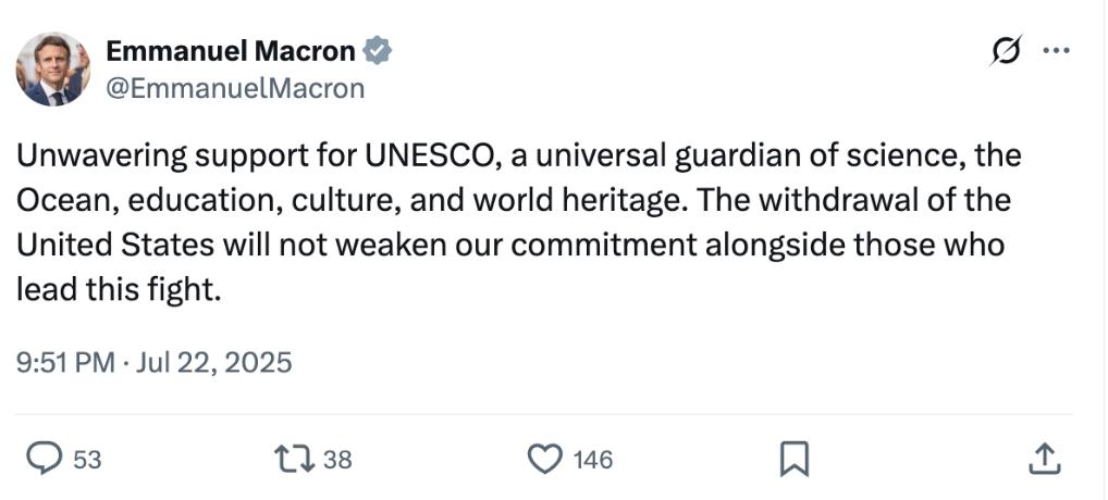 法国总统马克龙在社交媒体上对美国退出联合国教科文组织的决定作出回应。