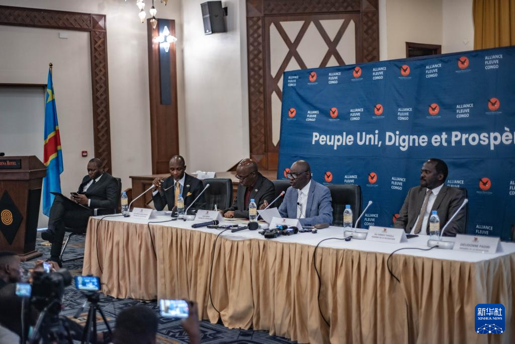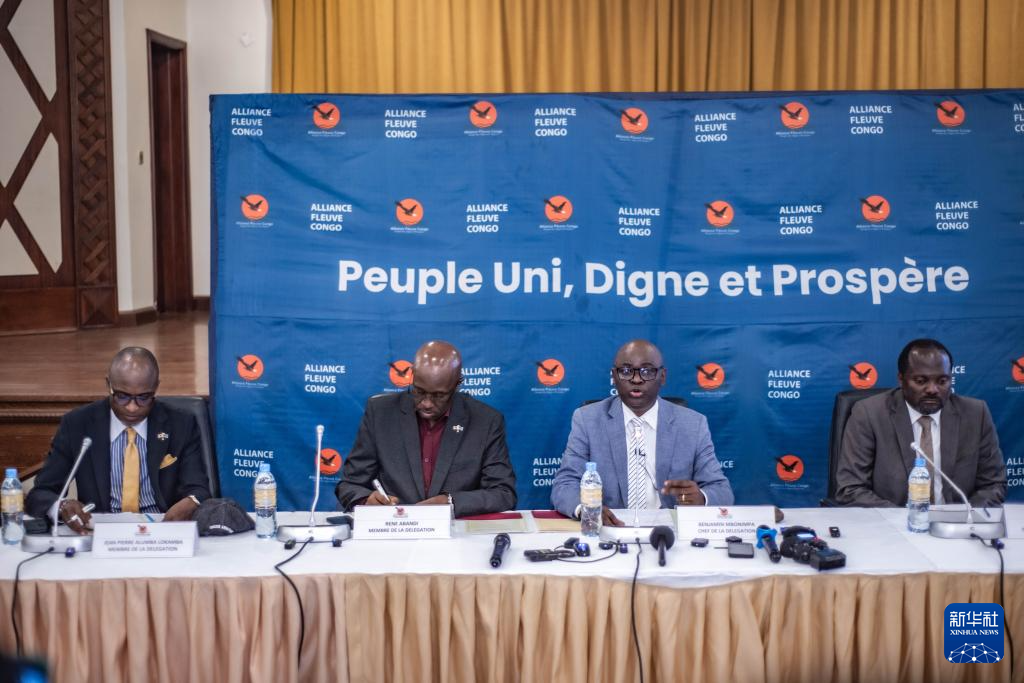 7月25日,在刚果(金)北基伍省首府戈马市,“M23运动”对话代表姆博宁帕(右二)出席记者会。新华社发(扎内姆·内蒂·扎伊迪摄)