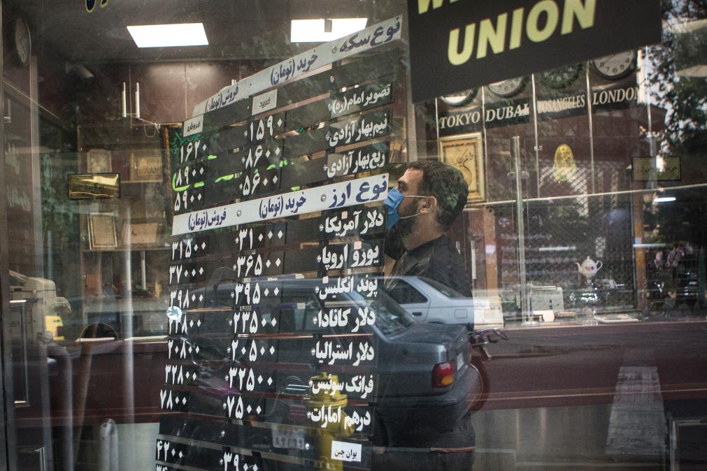 2020年10月14日,一名工作人员在伊朗德黑兰一处外币兑换所整理橱窗。新华社发(艾哈迈德·哈拉比萨斯摄)