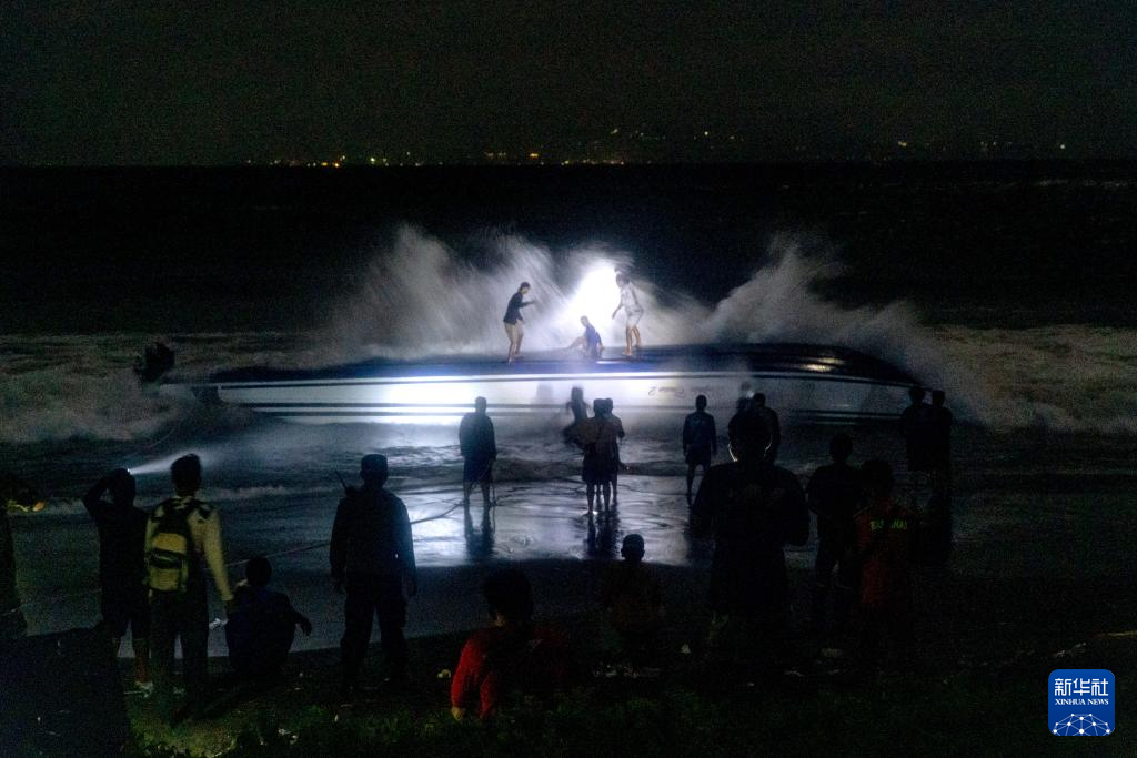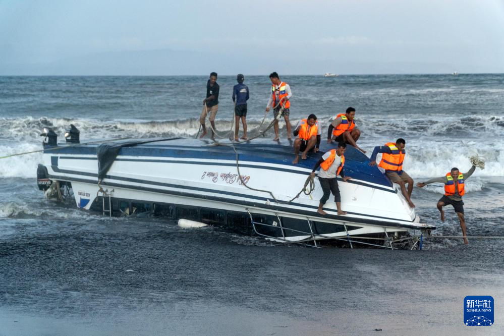 8月5日,在印度尼西亚巴厘岛,工作人员将倾覆快艇拉到岸边。新华社发(比辛拉西摄)