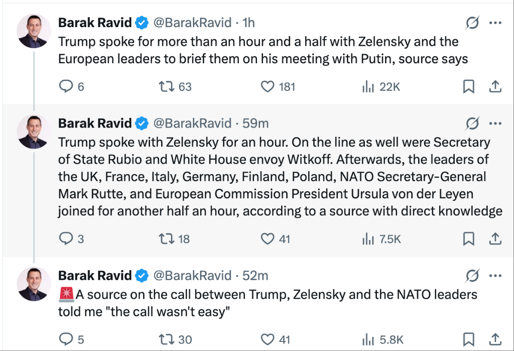 美国阿克西奥斯新闻网站记者巴拉克·拉维德在社交媒体平台X上披露,特朗普同泽连斯基通话约1小时,随后多位欧洲领导人加入,继续通话约半小时,气氛“不轻松”。