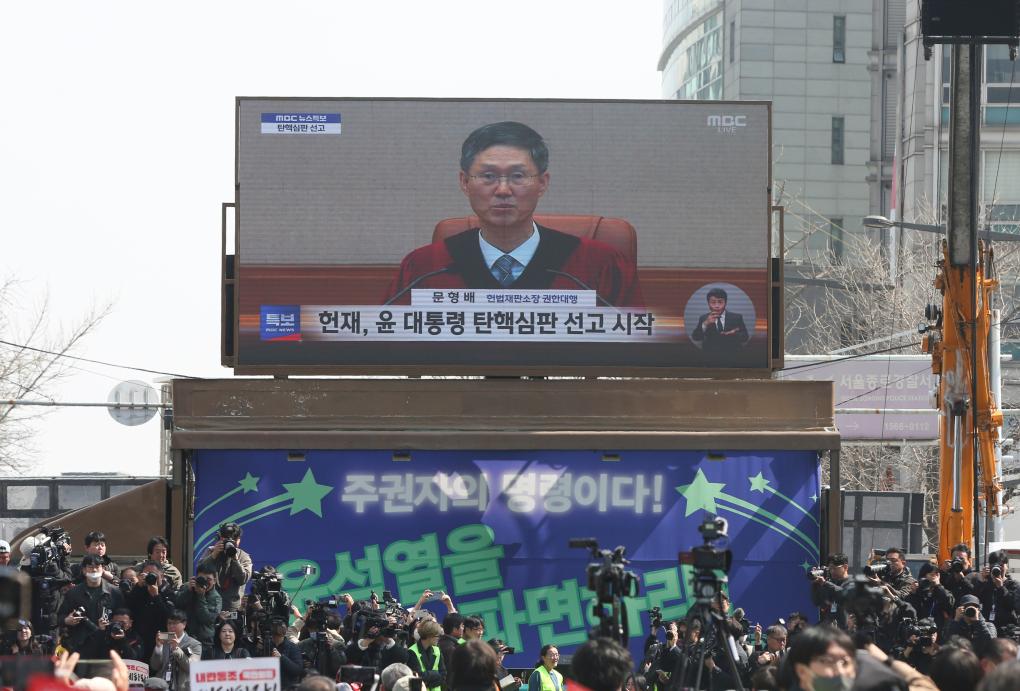 4月4日,民众在韩国首都首尔的韩国宪法法院附近观看尹锡悦弹劾案宣判过程的电视直播。新华社记者姚琪琳摄