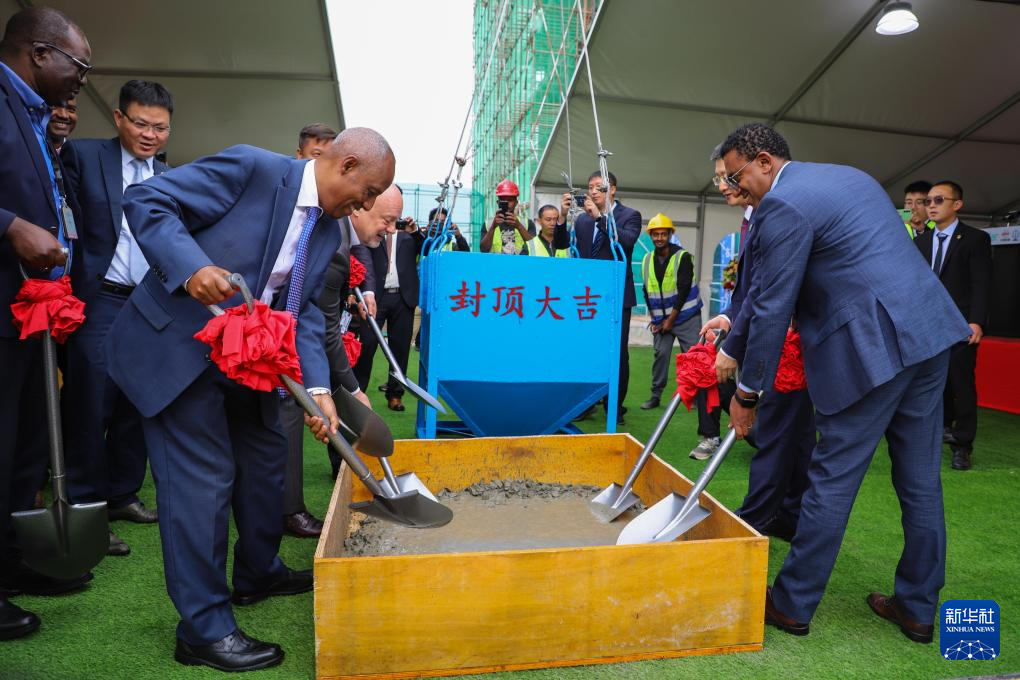 这是8月18日在埃塞俄比亚首都亚的斯亚贝巴拍摄的埃塞俄比亚航空公司总部大楼项目主建筑封顶仪式。新华社发(迈克尔·特韦尔德摄)