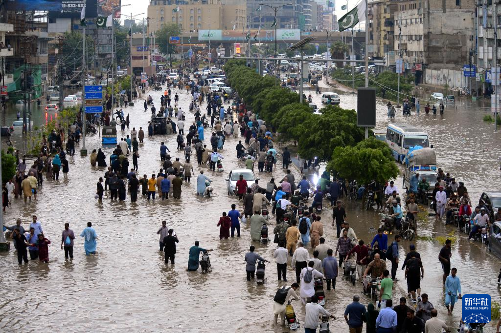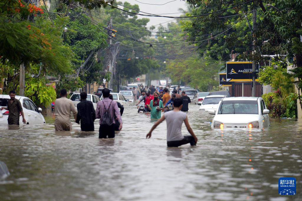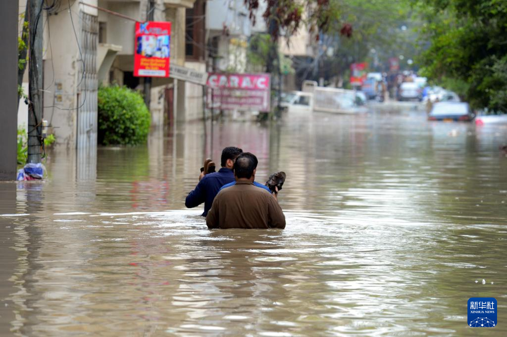 8月19日,在巴基斯坦南部港口城市卡拉奇,当地居民在暴雨过后涉水出行。新华社发