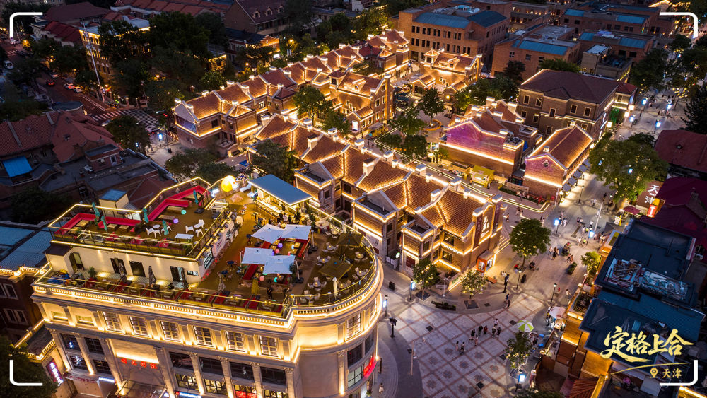 天津津湾广场沿岸海河夜景和楼体灯光。