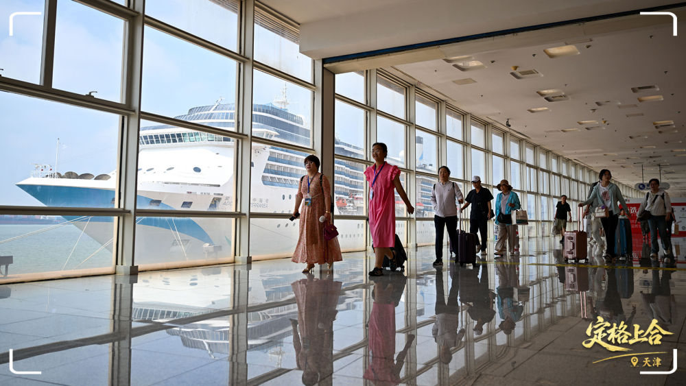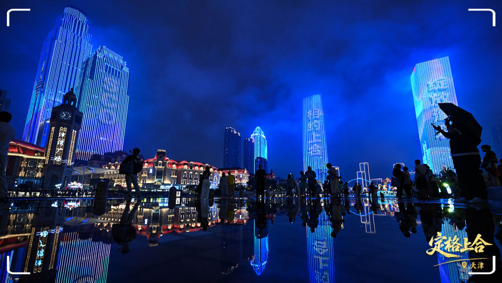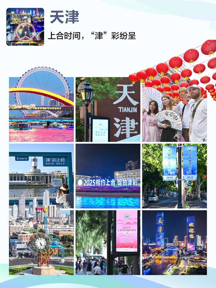 天津津湾广场,游客在一处“2025年上海合作组织峰会”主题装饰物打卡。