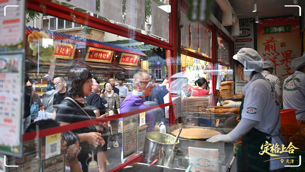 市民游客在天津市红桥区西北角特色街区购买煎饼果子。