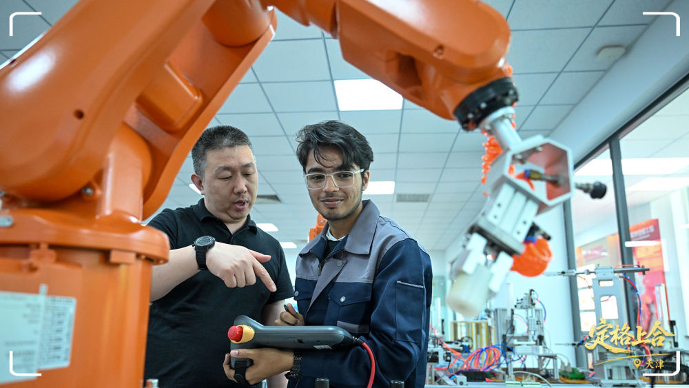 在天津现代职业技术学院鲁班工坊实训教室,教师指导来自巴基斯坦的学生操作设备。