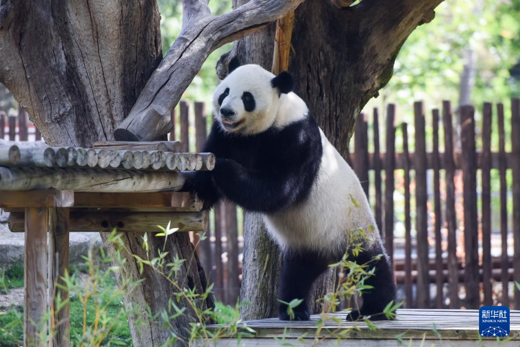9月20日,在西班牙马德里动物园,大熊猫“金喜”在玩耍。新华社发(古斯塔沃·巴连特摄)